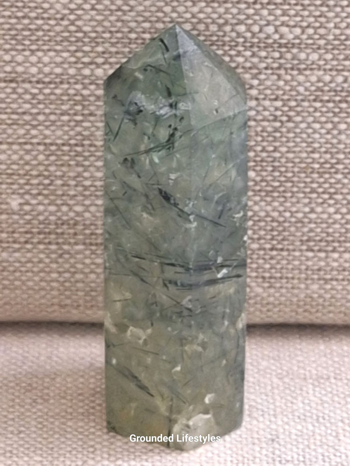 This 2.25-inch prehnite in epidote point is carved from naturally intergrown minerals—pale green prehnite with streaks, rods, or clusters of deep green epidote. The stone is shaped into a polished point with crisp facets that reveal the interplay between the two minerals: prehnite’s soft, glowing translucence and epidote’s bold, structural inclusions.