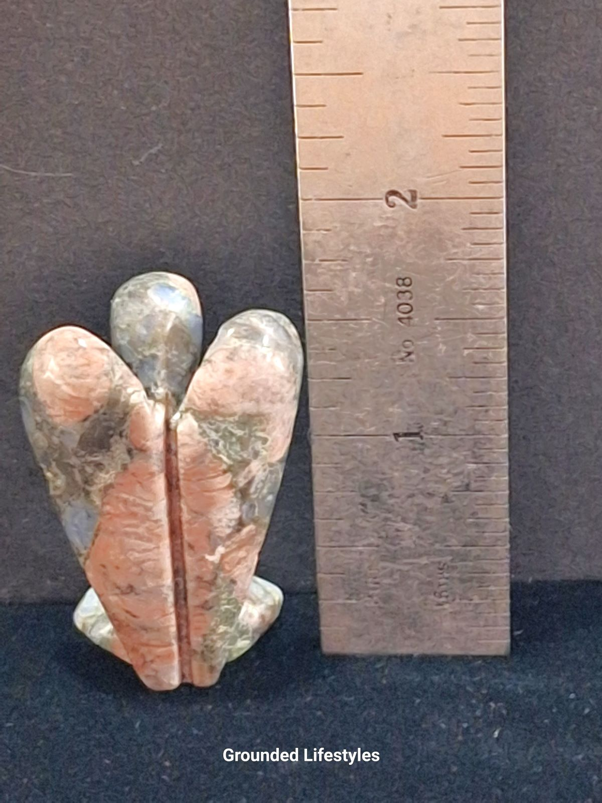 Expect mottled patterns of blue-gray and russet-brown feldspar in varying concentrations. Each 1.5-inch angel is unique in color distribution, sometimes showing flashes of lavender or dark magnetite flecks. The fine polish enhances the stone’s reflective grain, giving the carving an elegant, organic texture.