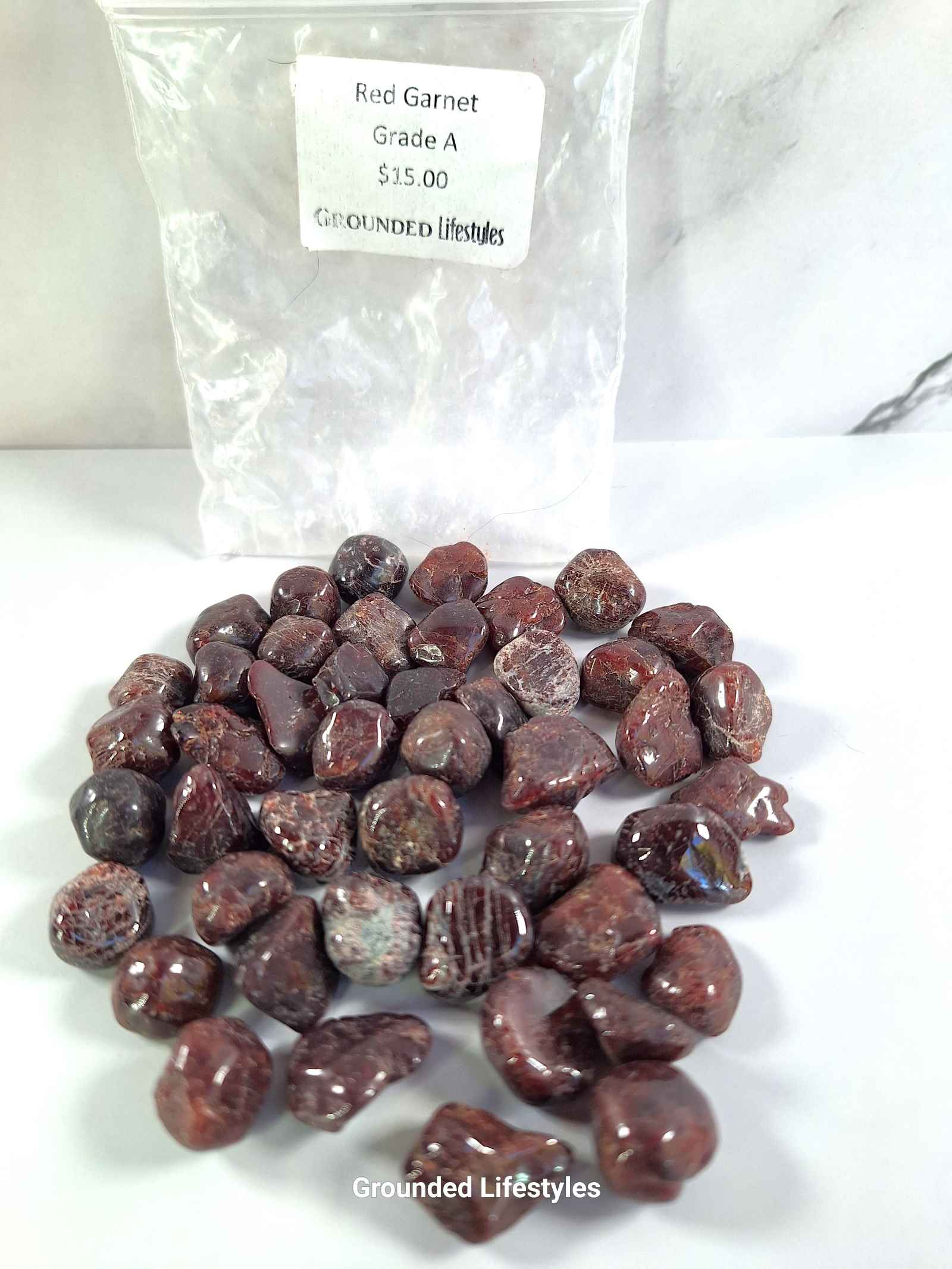 Polished tumbled garnets display a striking translucent red to reddish-brown tone, often with internal flashes that mirror embers under light. Their dense weight and consistent polish give them a tactile, grounding feel prized by collectors and healers alike.