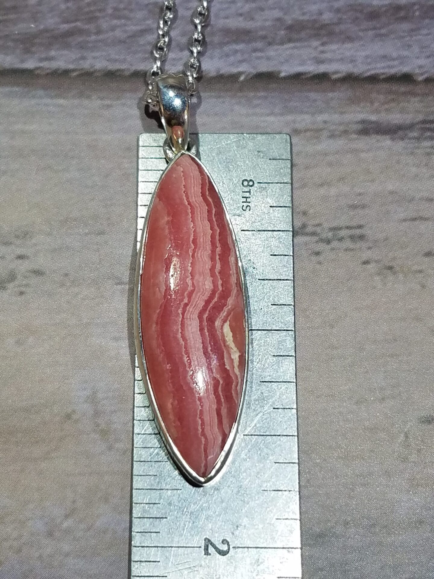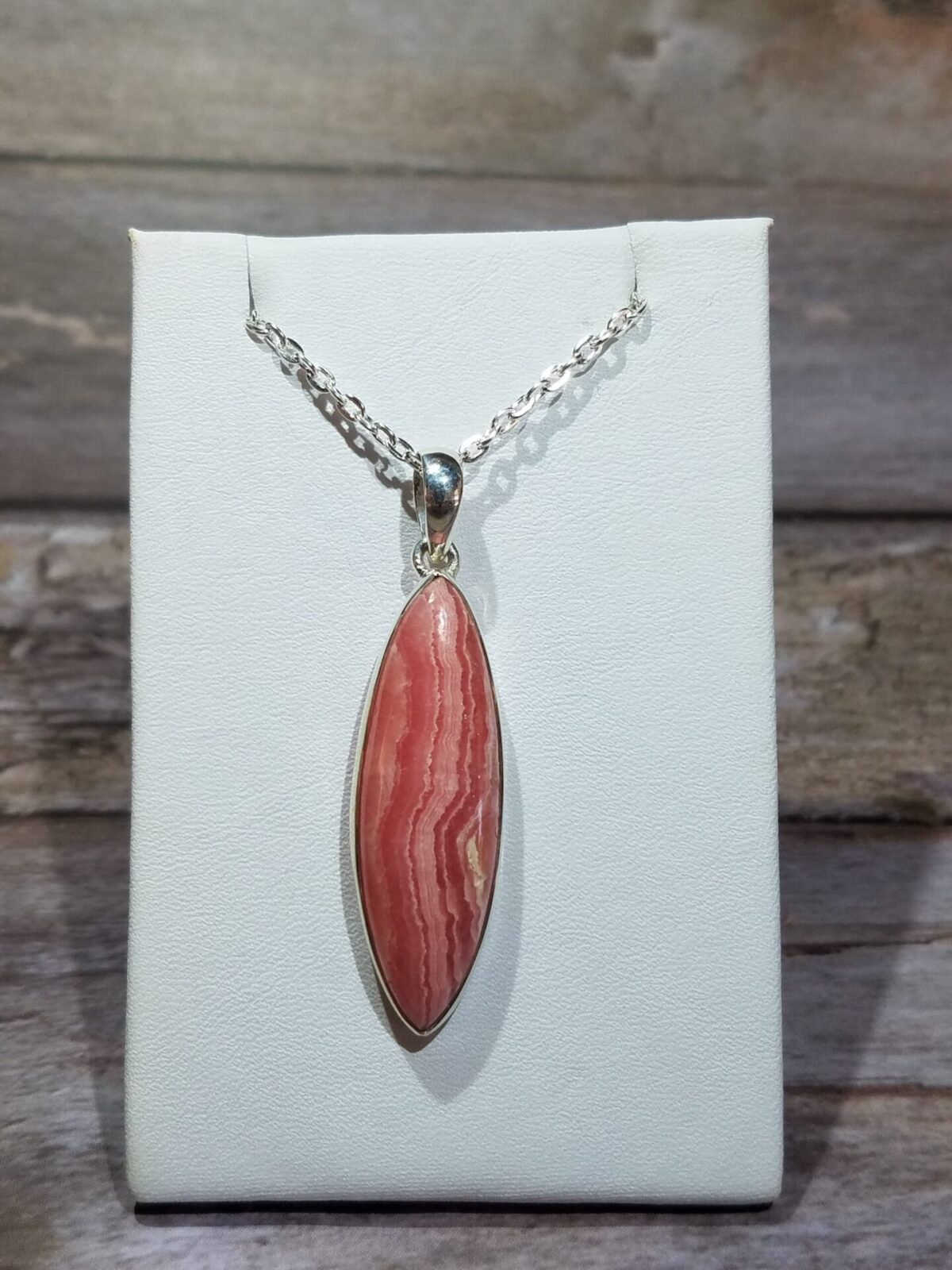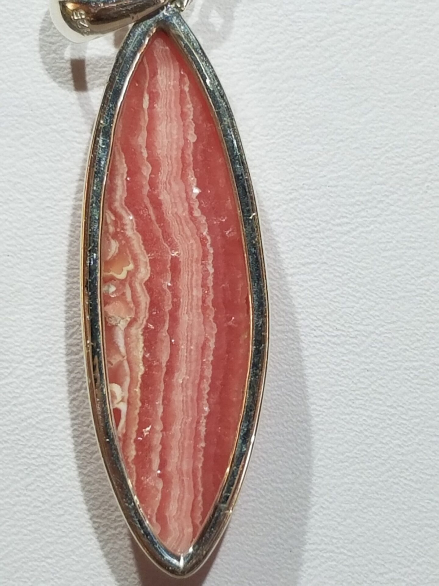This pendant’s gemstone originates from Argentina’s Capillitas Mine, the world’s most famous locality for high-quality rhodochrosite. Here, volcanic activity and hydrothermal fluids produced intricate concentric bands of vivid pink, rose, and white.