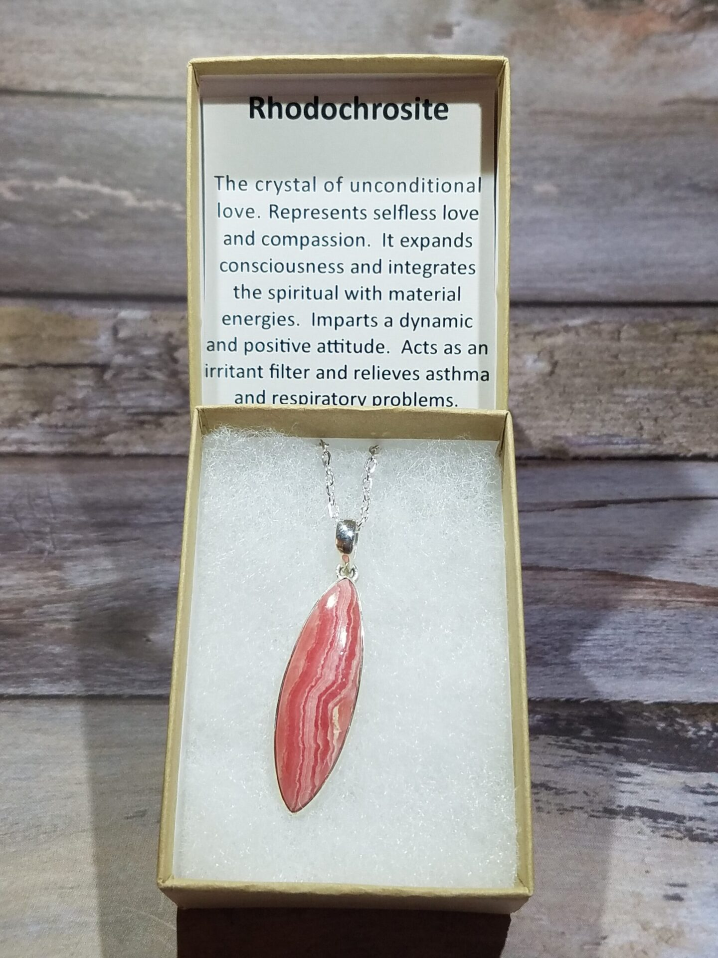 This Rhodochrosite Oval Pendant features a hand-polished, elongated oval cabochon showcasing the stone’s signature banded pink and cream patterns. Measuring 1.5 inches long by ½ inch wide, the gemstone is securely bezel-set in Sterling Silver 925, emphasizing its elegant vertical profile. Each pendant includes a silver-plated 18-inch chain, removable metaphysical tag, and a gift box for presentation or storage.