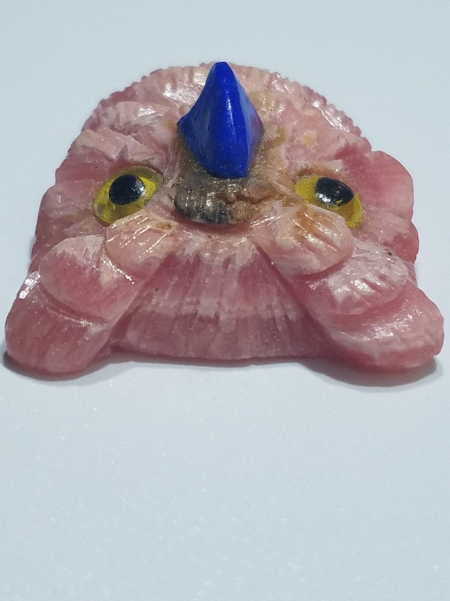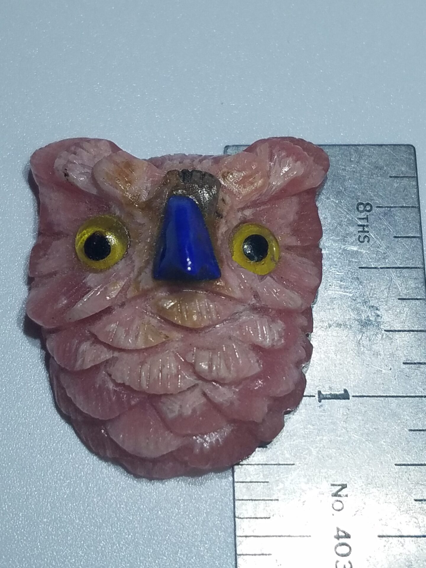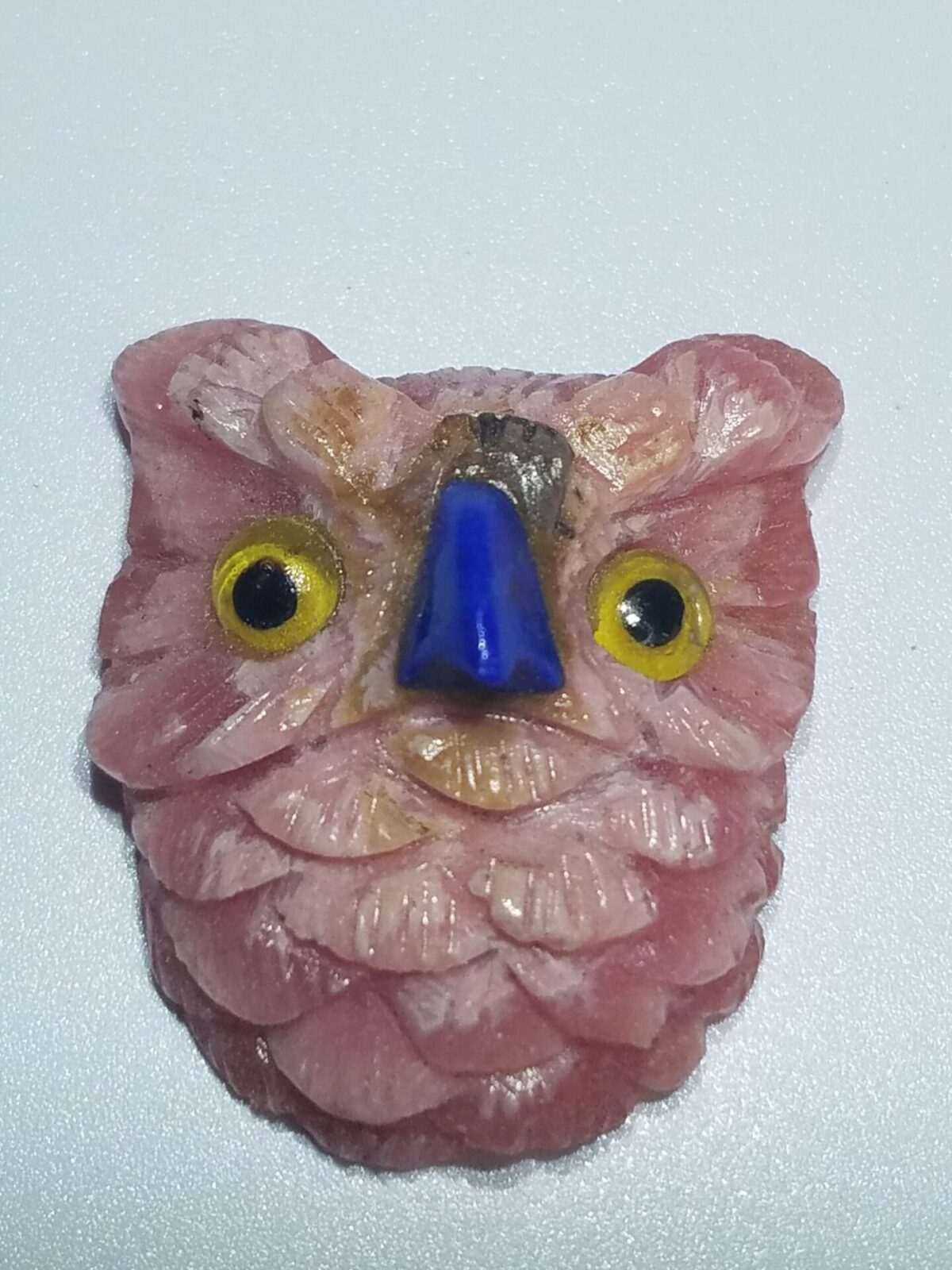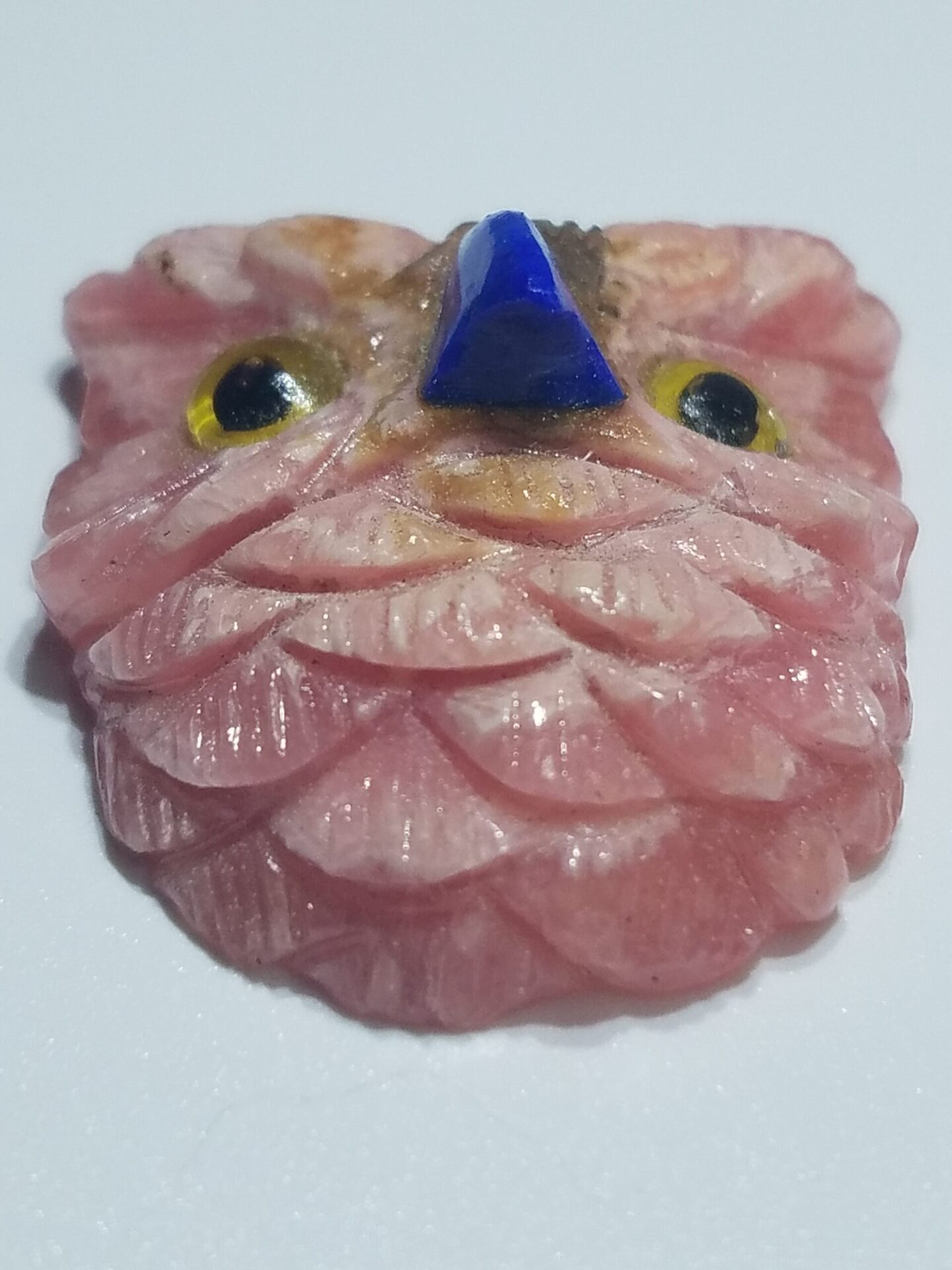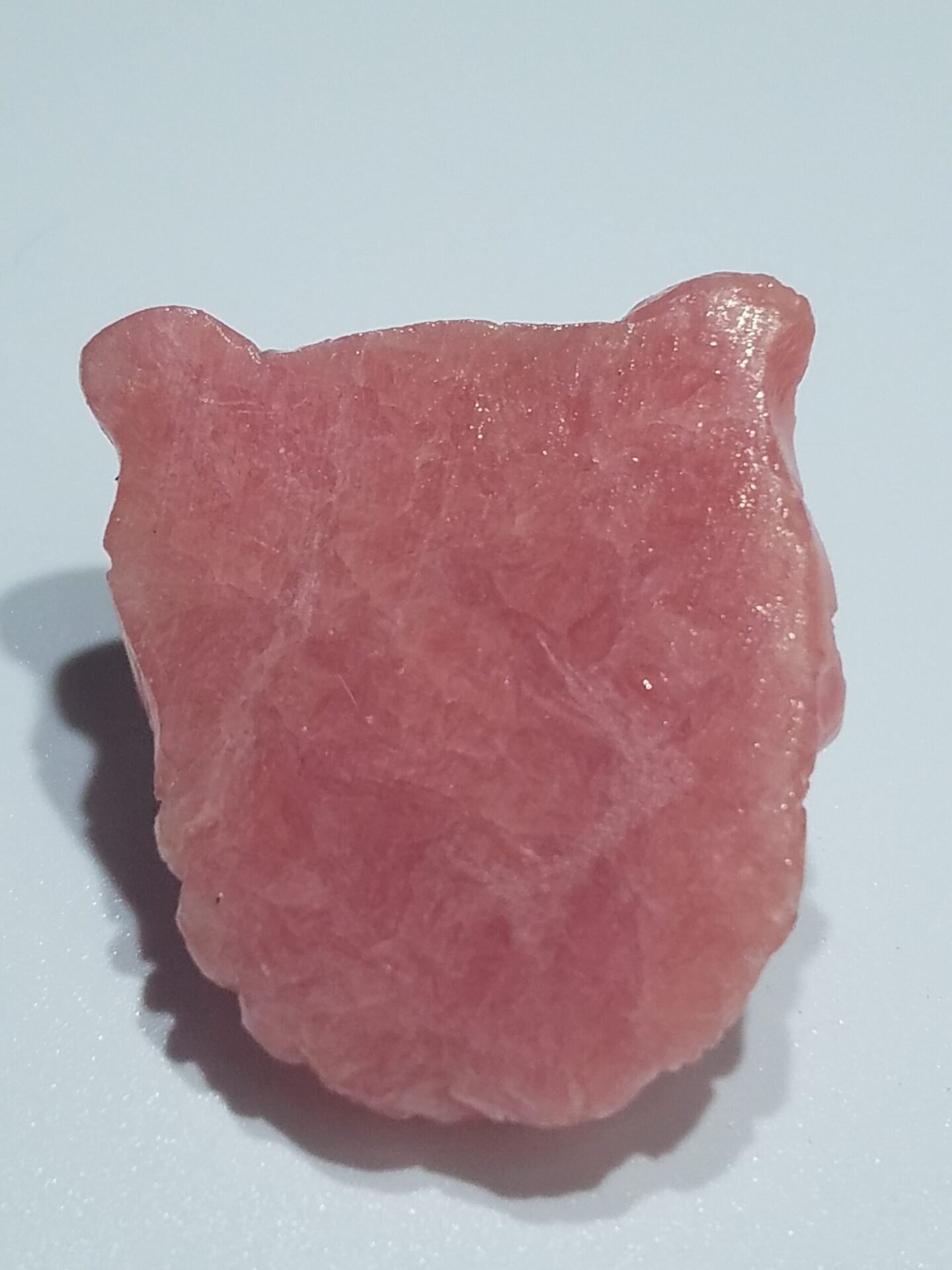 This owl head is carved from rhodochrosite, a vibrant pink and white gemstone formed in mineral-rich hydrothermal veins. High-quality rhodochrosite is sourced from Argentina and Peru, where conditions allow for its distinctive banding and coloration. The stone has a Mohs hardness of 3.5–4, allowing for precise hand-carving while remaining durable for display. This particular piece is from Argentina.