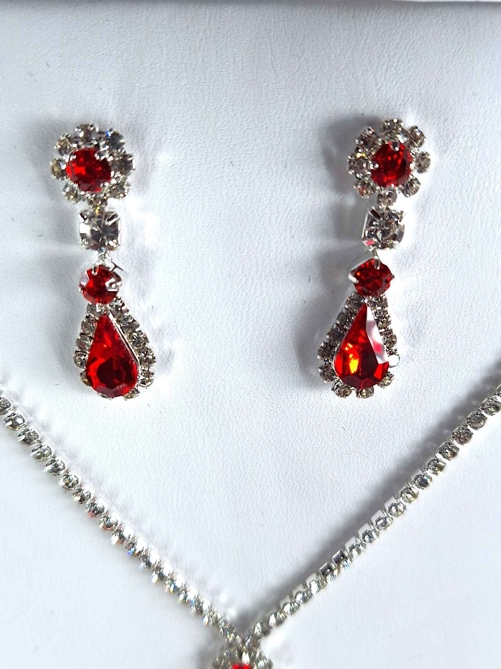 Make a statement with this Ruby Cubic Zirconia Necklace and Earring Set. Featuring brilliant ruby-red stones, precision-cut to capture and reflect light, this set exudes elegance and sophistication. Whether worn at a party, a romantic evening, or a special event, it’s designed to make you shine.