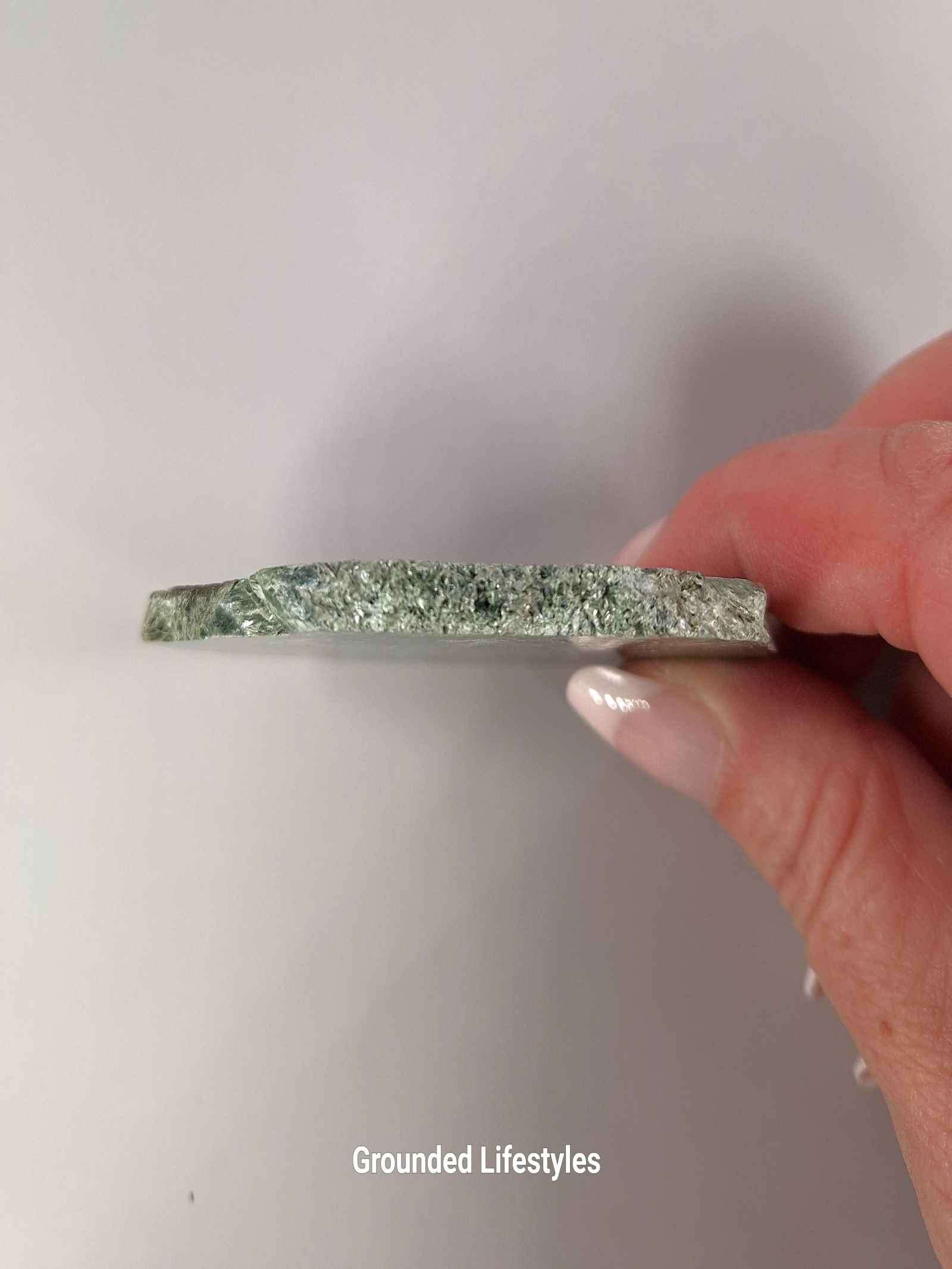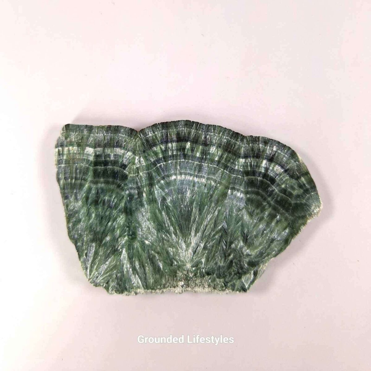 This authentic Seraphinite slice from Siberia is renowned for its unique feather-like inclusions and deep green coloration. The mineral’s chatoyant properties create a shimmering effect, making each piece distinct and captivating.