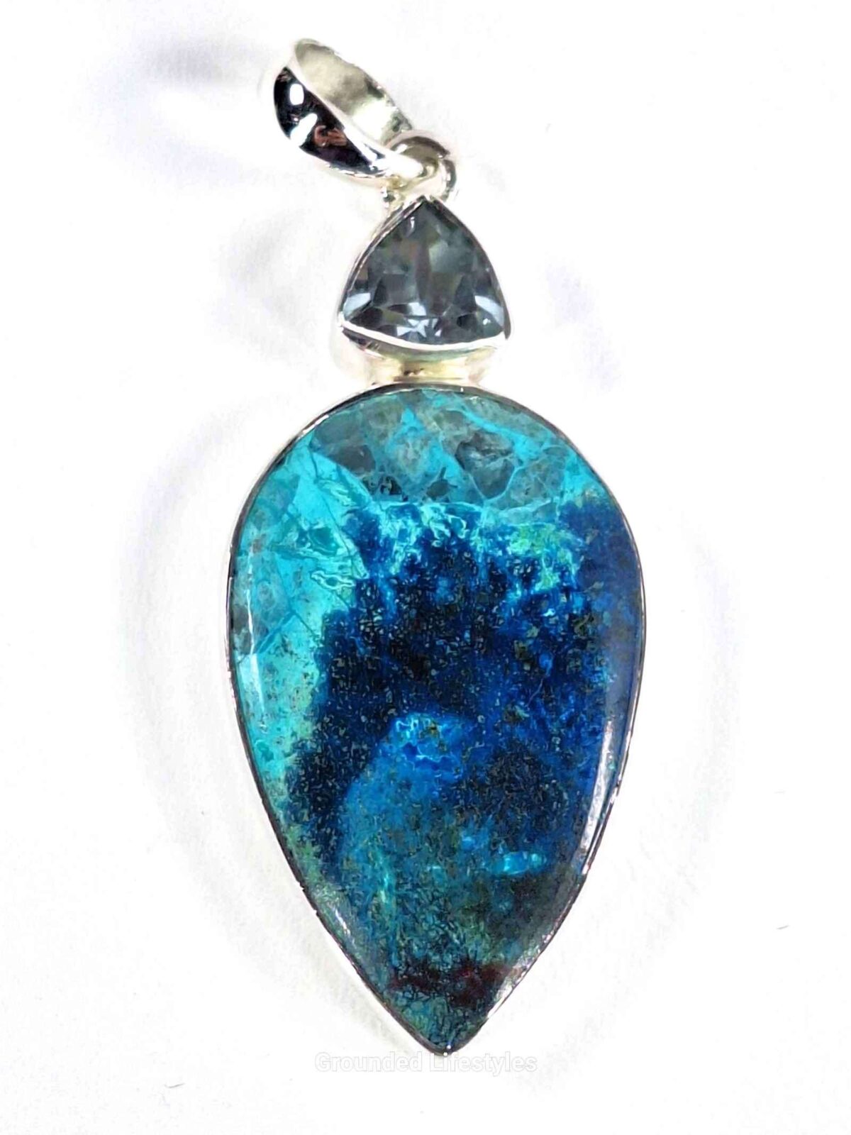 This Shattuckite & Blue Topaz Sterling Silver Pendant brings together two remarkable stones in one elegant design. Measuring 1.5″, the pendant is set in polished sterling silver 925, highlighting the deep ocean-blue patterns of shattuckite alongside the crystalline sparkle of blue topaz. Complete with a 20″ chain and gift box, this piece blends rarity, beauty, and meaning in a wearable form.