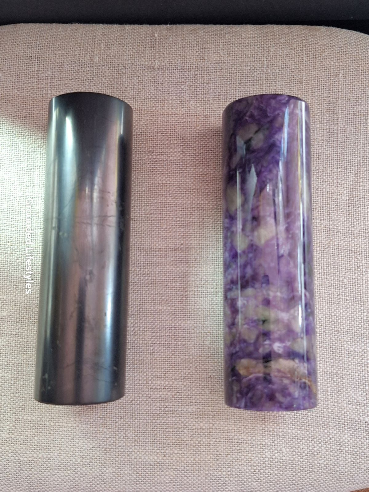 Together, they create a visual and tactile duality: the Shungite rod representing grounding conductivity, and the Charoite rod symbolizing insight and transformation.