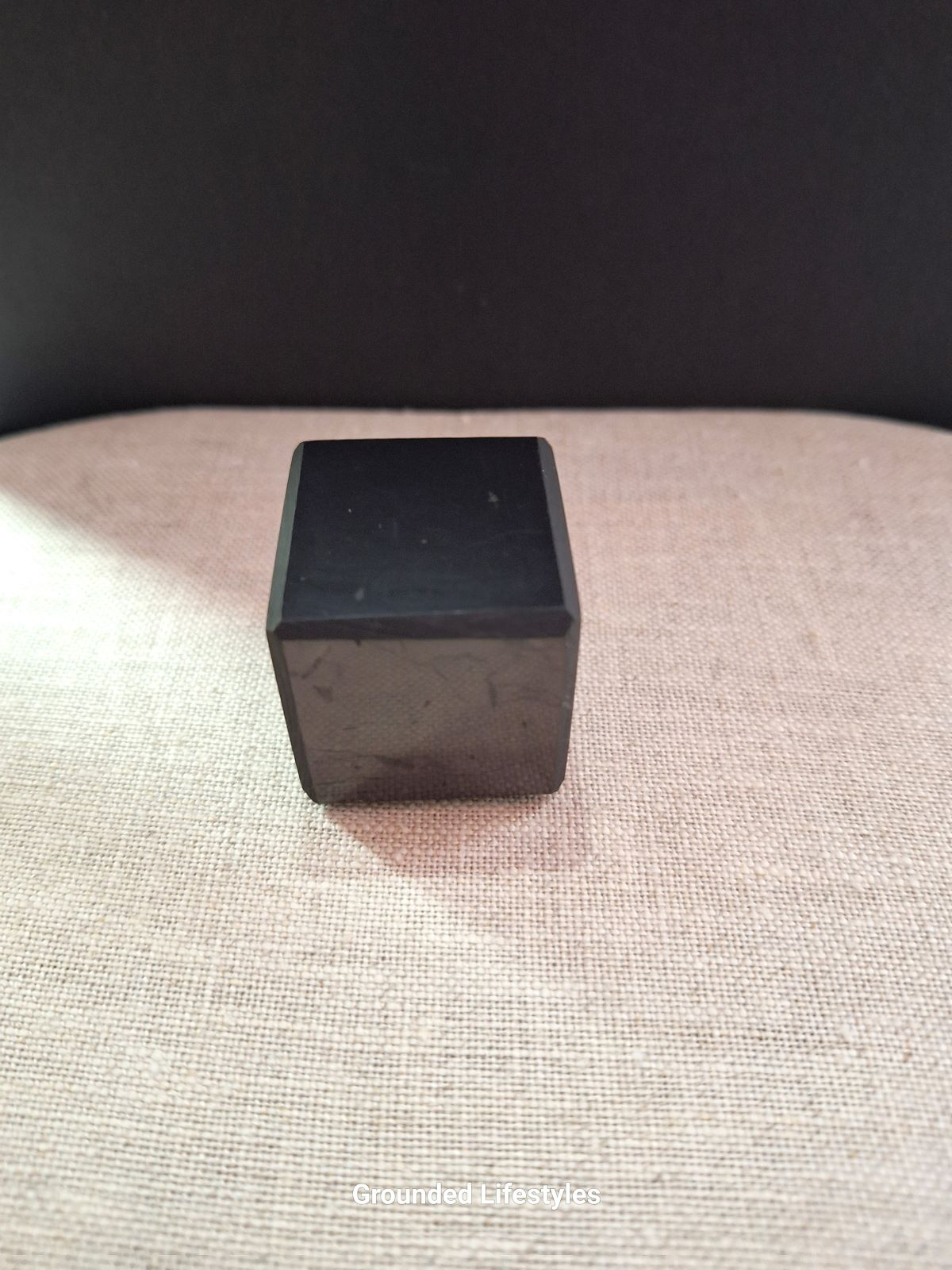 The 1.25-inch polished cube presents deep metallic-black reflectivity and fine microfractures characteristic of genuine Karelian Shungite. Cubic geometry enhances its symbolic and visual appeal, representing stability and elemental order — while also maximizing flat surface exposure for display or conductive use.