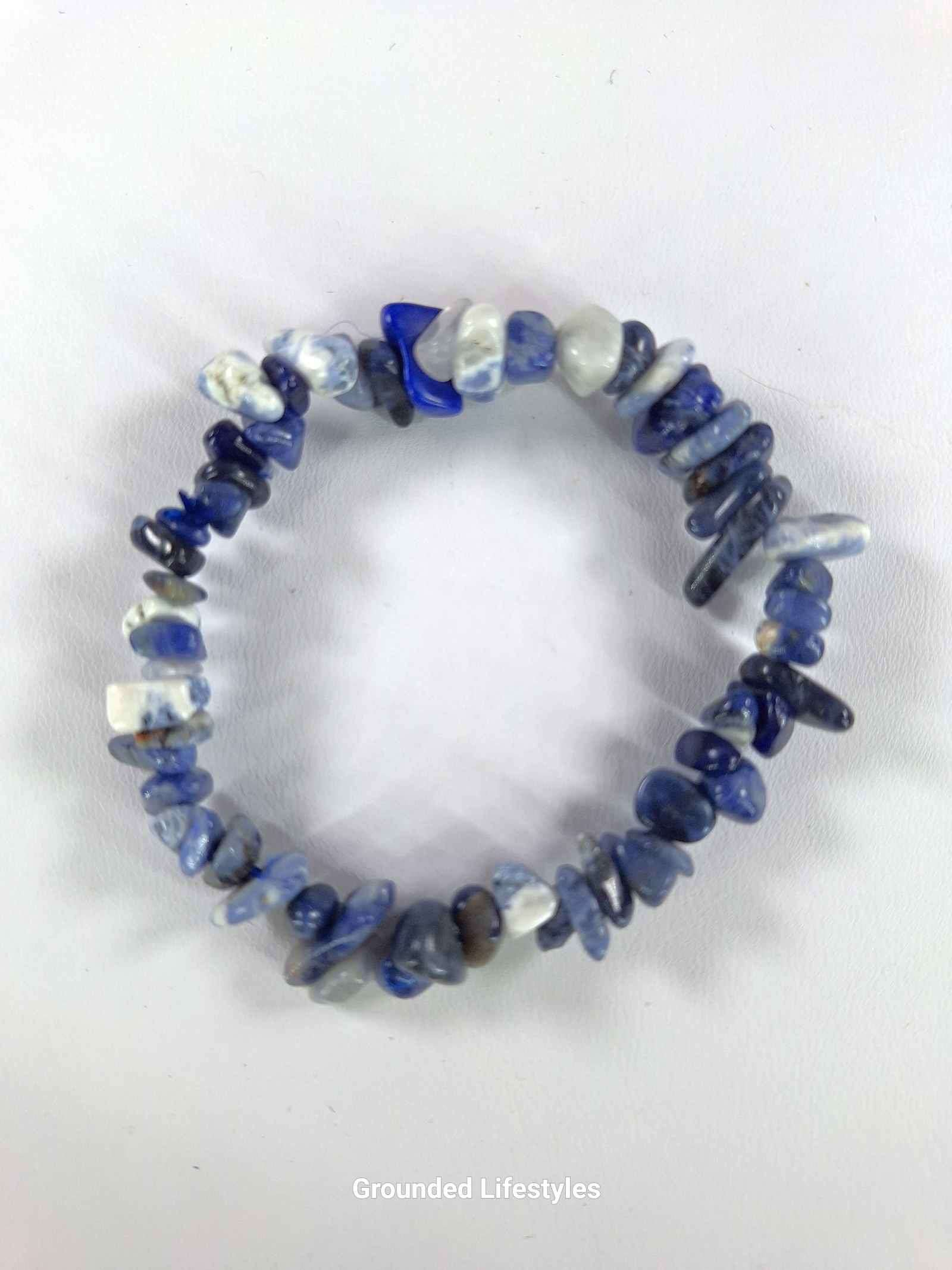This Sodalite chip bracelet captures the beauty of the night sky in stone. With its deep indigo blue tones streaked with white calcite, sodalite is both visually striking and symbolically rich. Each chip bead highlights the natural uniqueness of this gemstone, offering an earthy, raw look that complements both casual and spiritual styles.