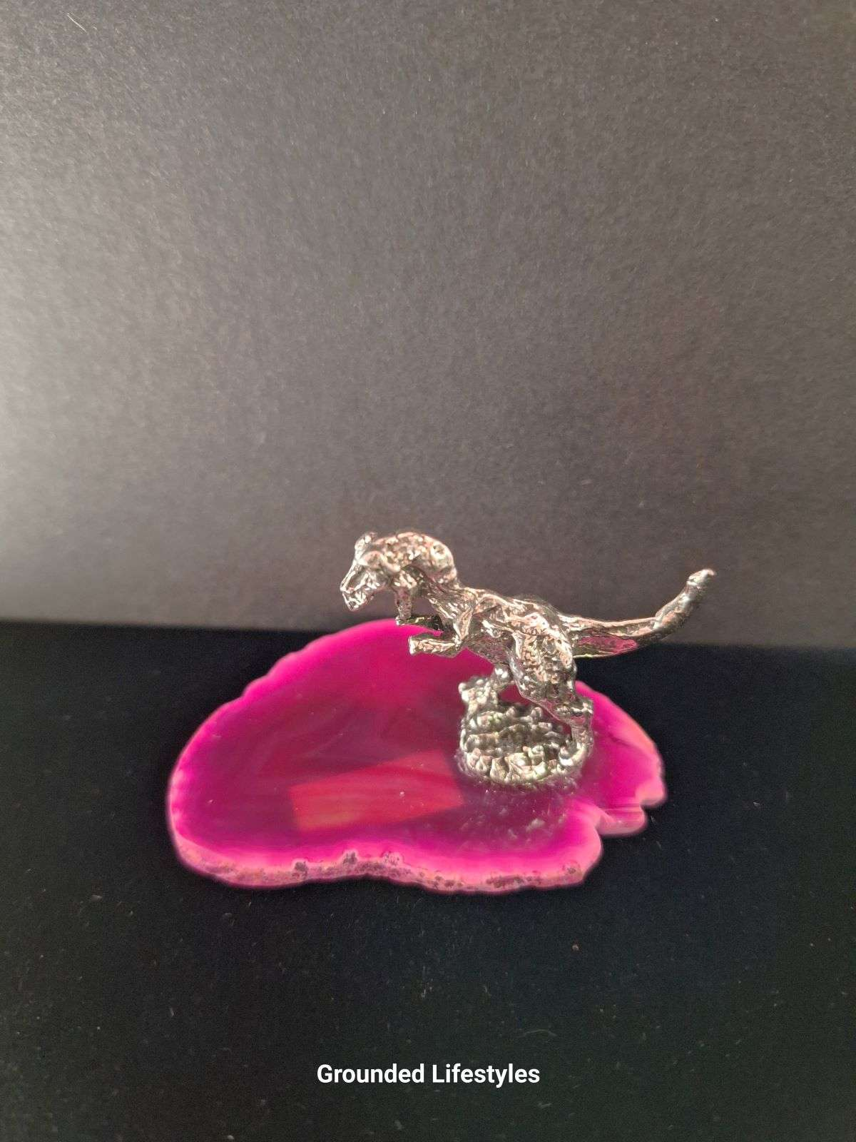 Each sculpture features a hand-cast pewter T-Rex, rich in texture and detail, standing atop a genuine pink agate slice. The gleaming pewter dinosaur contrasts perfectly with the soft rose-to-mauve hues of the agate base, creating a unique fusion of metallic power and natural charm. Every base has its own banding and translucence—no two are ever alike.