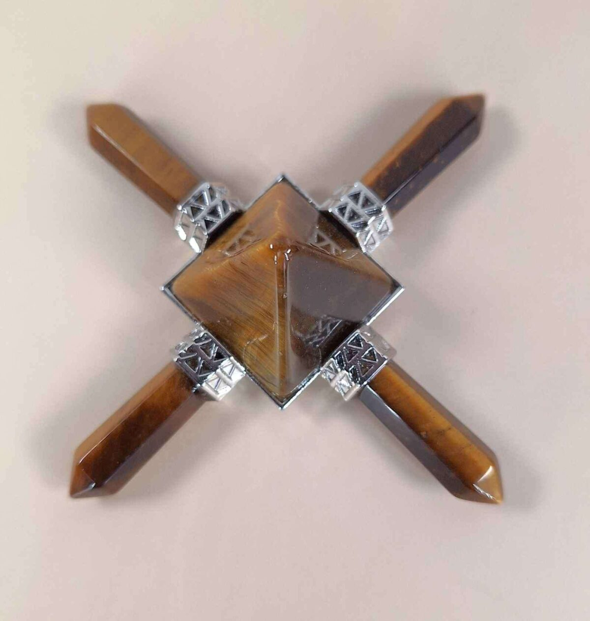 This Tiger Eye 4-Direction Generator features a central pyramid with four extending points, creating a symmetrical energy tool. The natural golden-brown hues of Tiger Eye enhance its visual appeal and suitability for spiritual or decorative purposes.