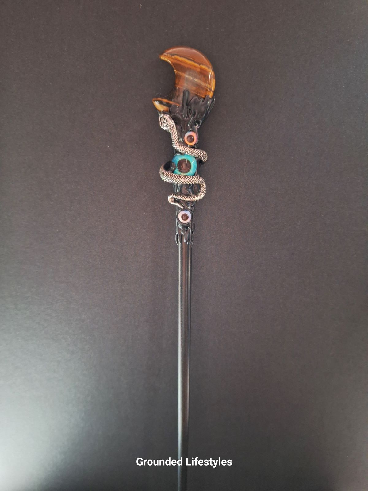 This wand channels the combined energies of Tiger Eye and lunar symbolism.