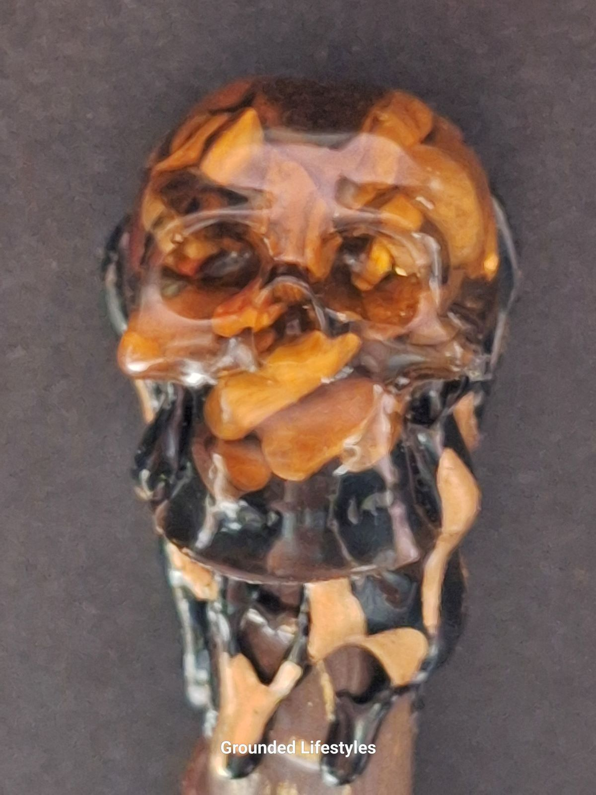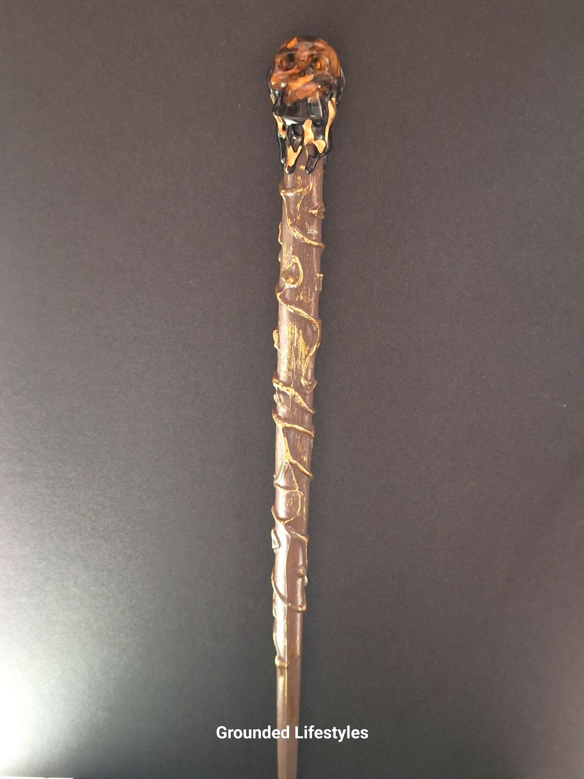 This wand radiates warm golds, deep browns, and bronze reflections, characteristic of premium-grade tiger eye. The resin body enhances the stone’s depth, while the elongated design (12.5 inches) creates a refined, commanding presence. Subtle detailing within the resin base complements the gemstone’s metallic shimmer, giving each wand a unique, handcrafted identity.