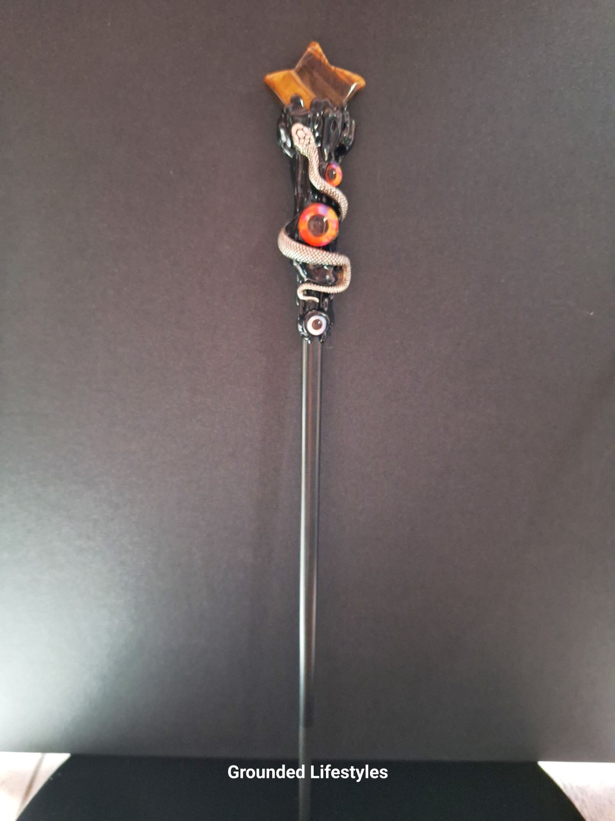 At 11 inches in length, this wand has a strong, balanced presence — equally suited for altar work, meditation, or collector display. The golden shimmer of Tiger Eye contrasts beautifully with the cool silver serpent and dark resin base, creating a dynamic visual statement.