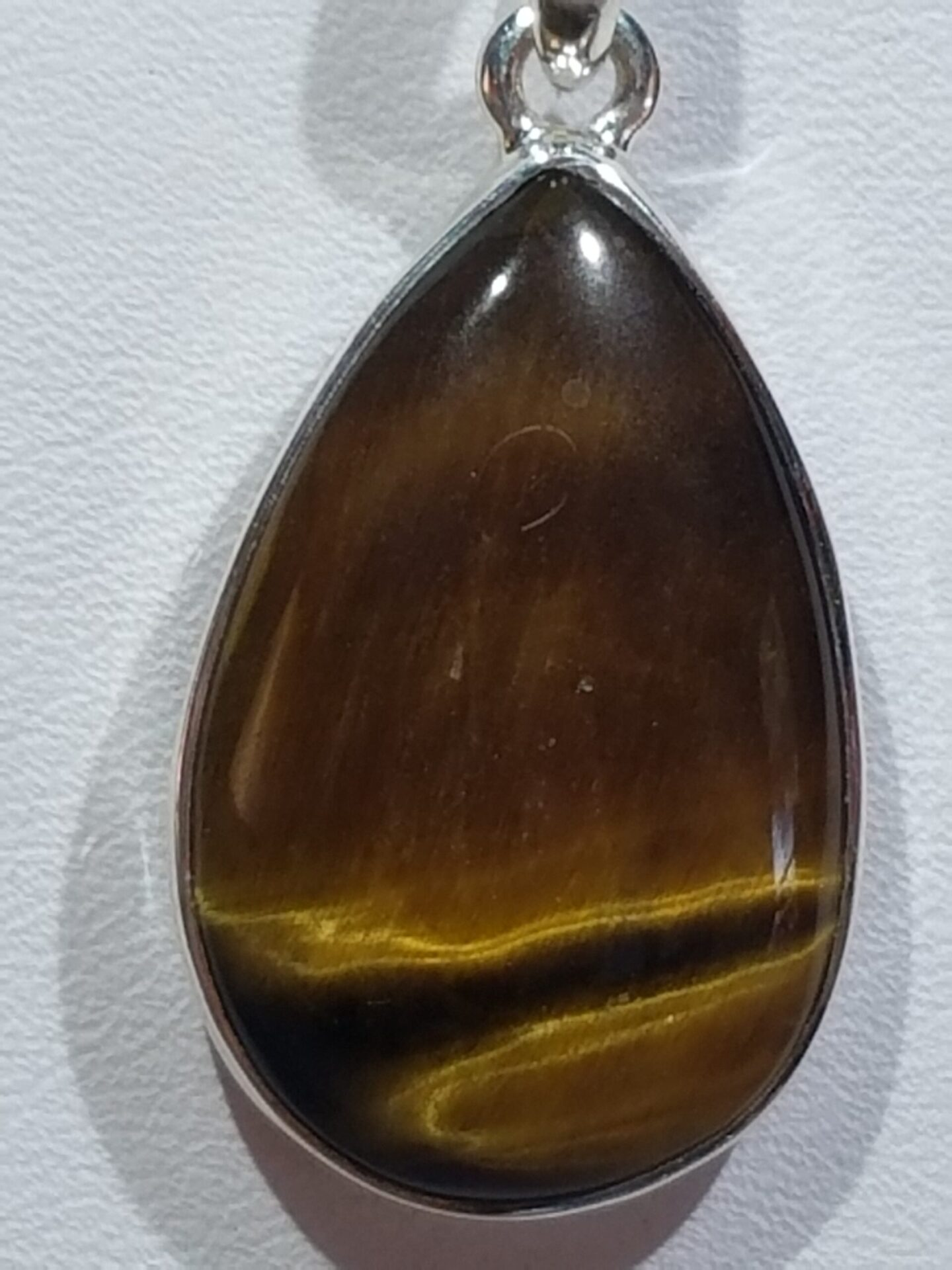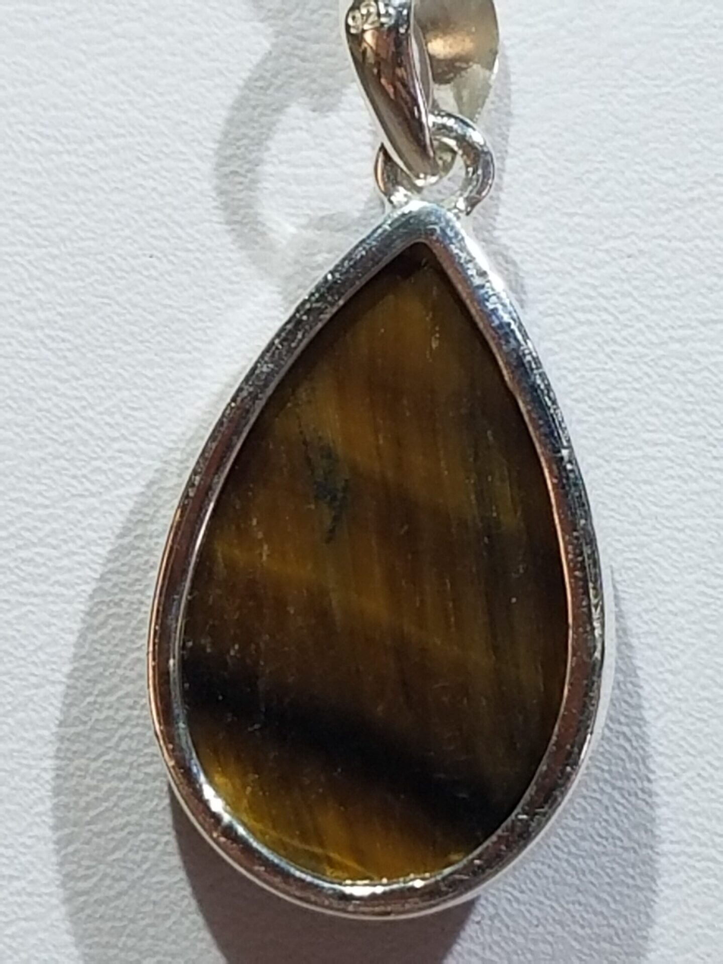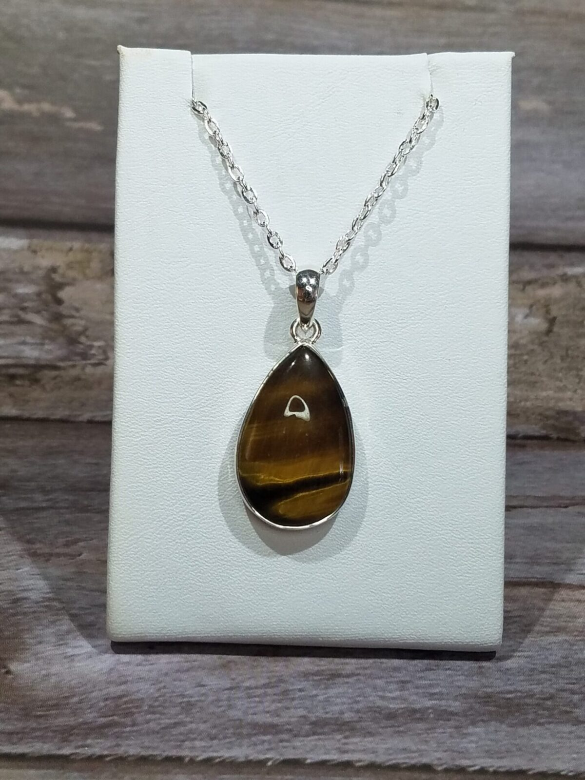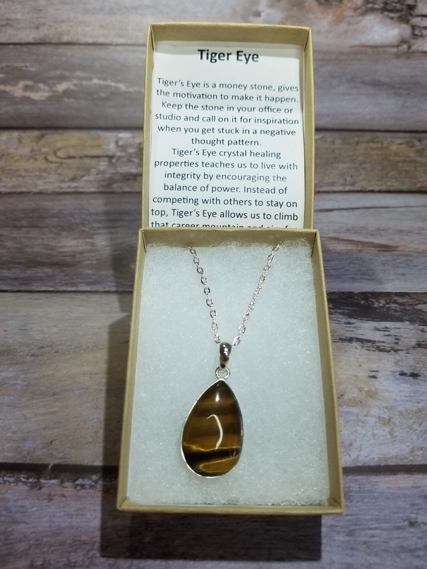 This Tiger Eye Tear Drop Pendant is hand-crafted in Sterling Silver 925, measuring 1 inch long by 0.5 inches wide. The gemstone exhibits the signature golden chatoyancy that glides across its surface like a cat’s eye when turned in light. Each pendant includes a silver-plated 18-inch chain, a removable metaphysical tag, and a gift box for presentation or storage.