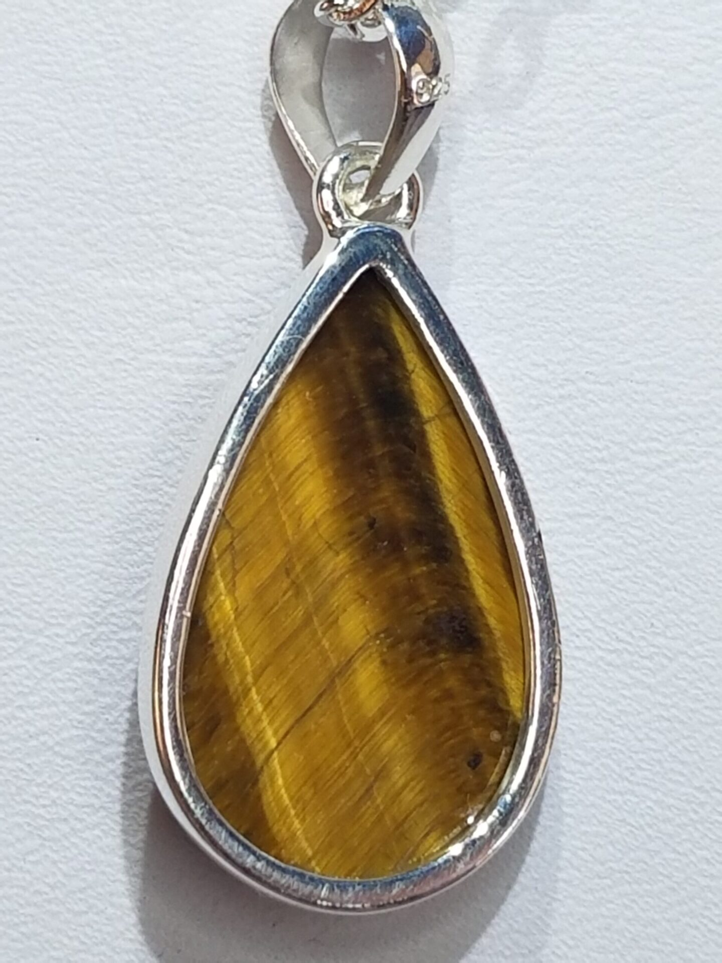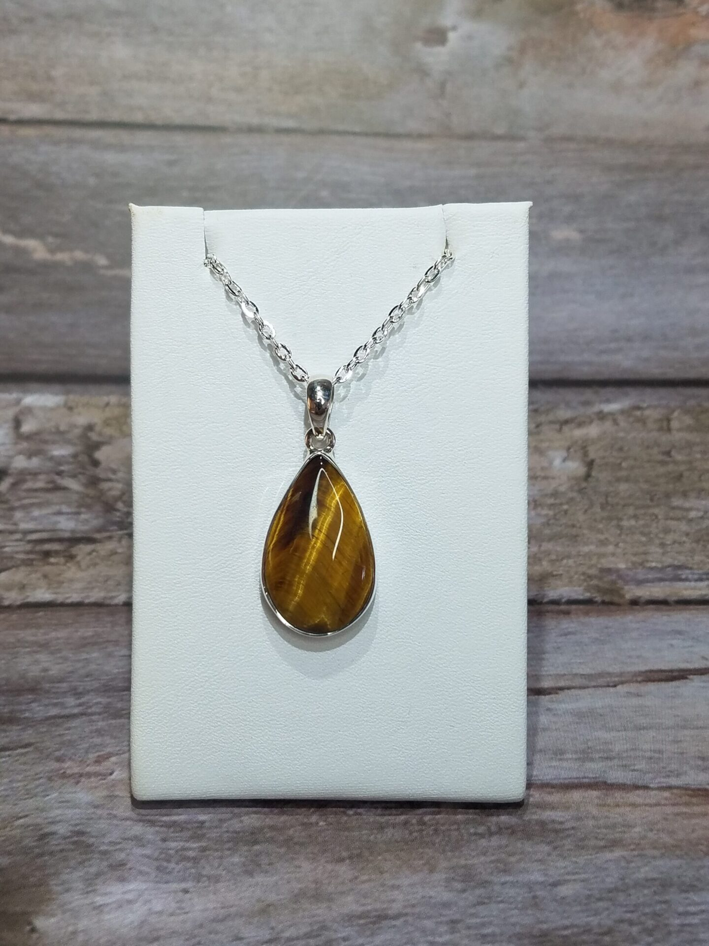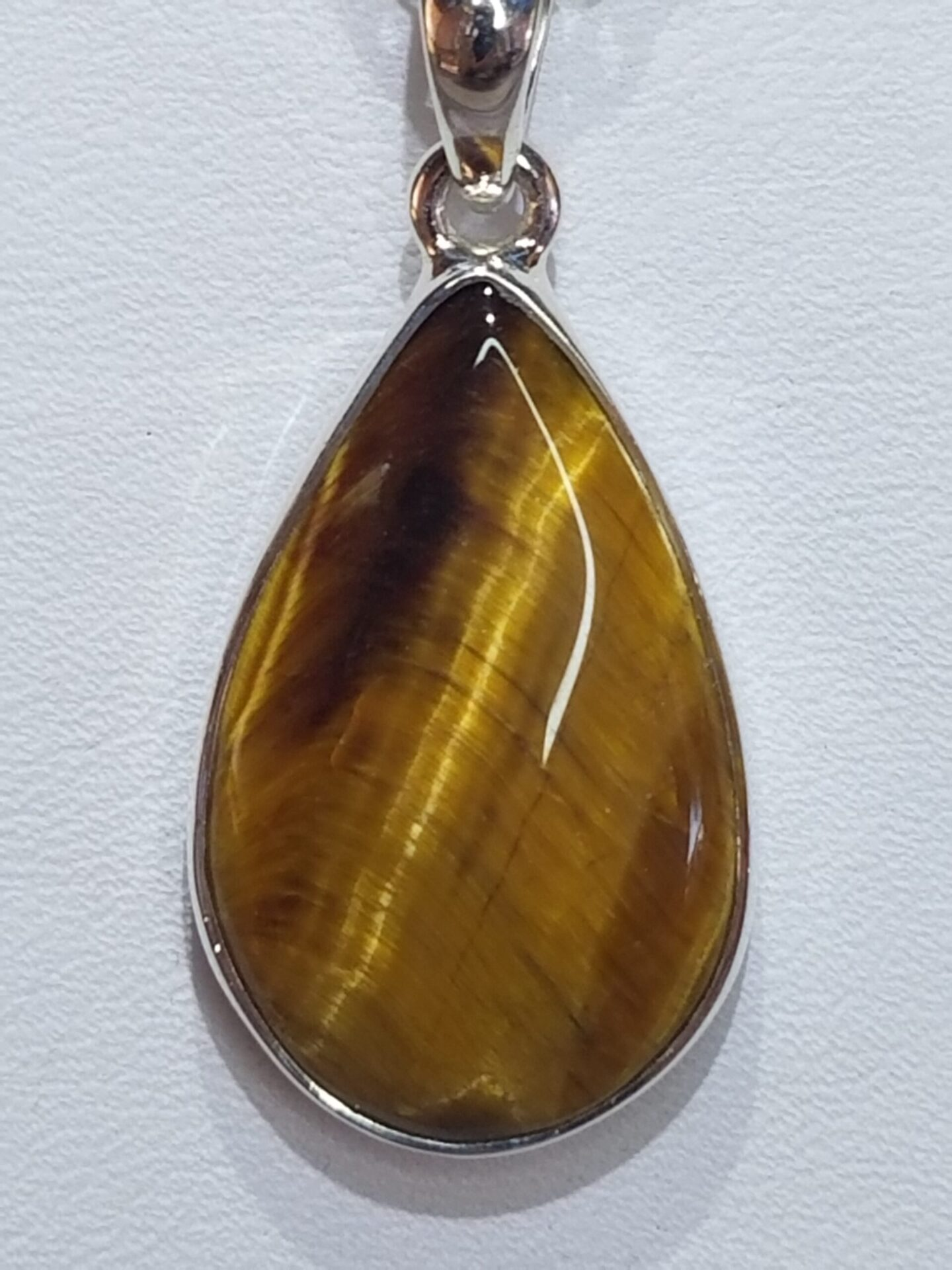 This Tiger Eye Teardrop Pendant is hand-cut and polished to reveal the gem’s distinctive golden shimmer. Measuring 1.5 inches long by 1 inch wide, it is set in Sterling Silver 925 and paired with an 18-inch silver-plated chain. The teardrop form enhances the stone’s natural linear fibers, producing a vertical, luminous band that glides across the surface when it catches light. Each pendant comes in a gift box with a removable metaphysical tag describing the gemstone’s symbolism.