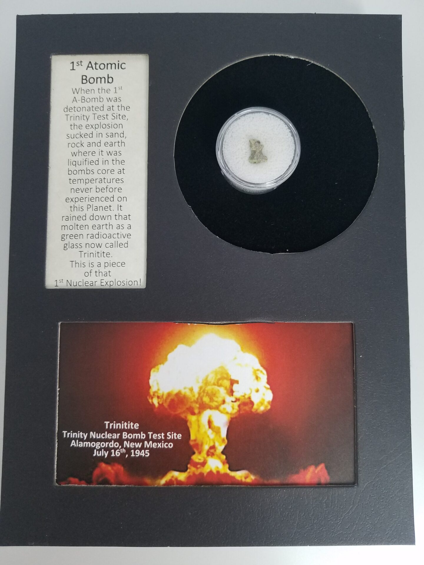 Handsome Display featuring a specimen of Trinitite from the original Atomic Bomb in New Mexico in 1945. Case measures 6 inches long by 8 inches high and .75 inches wide. The front of the display is glass.