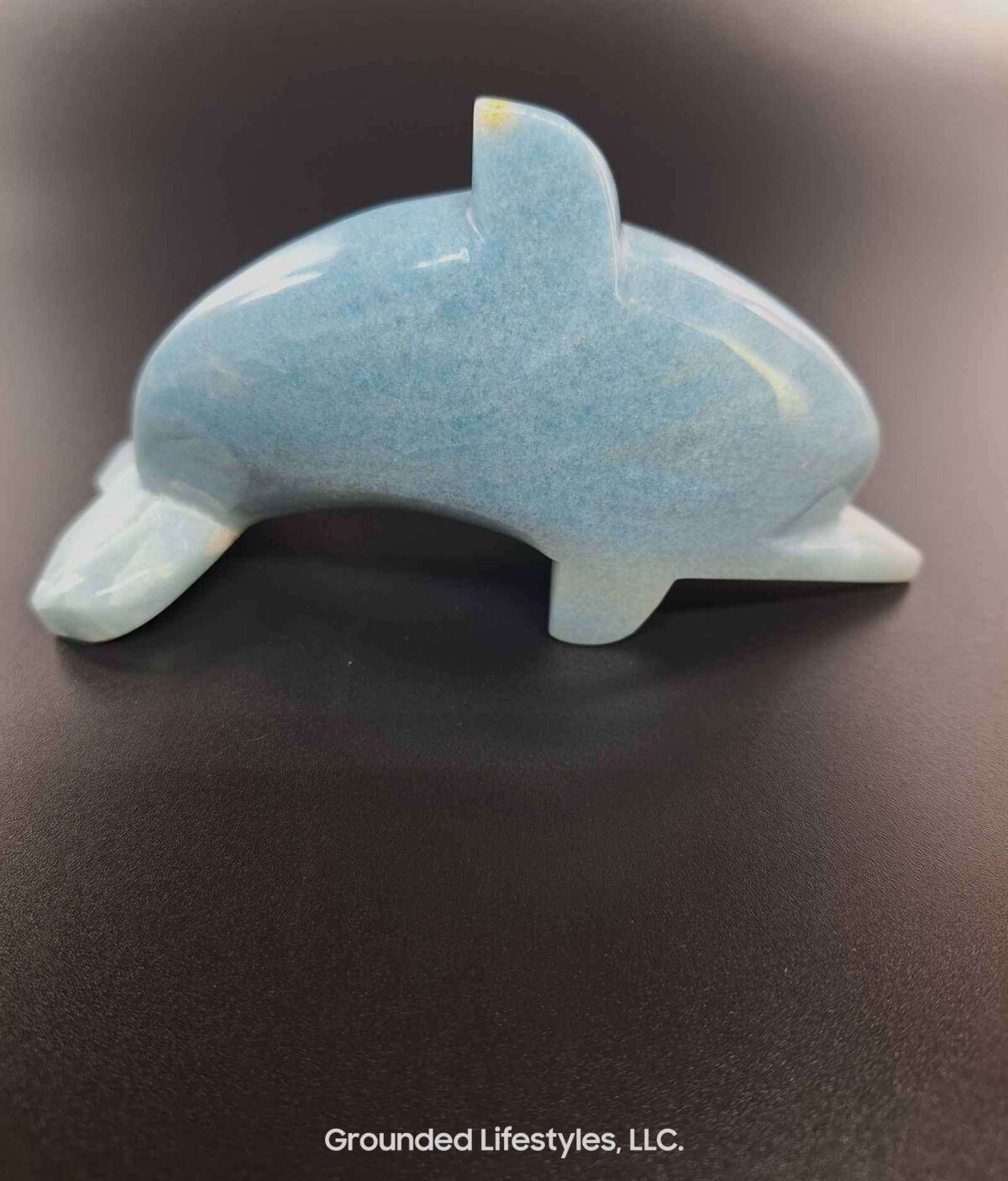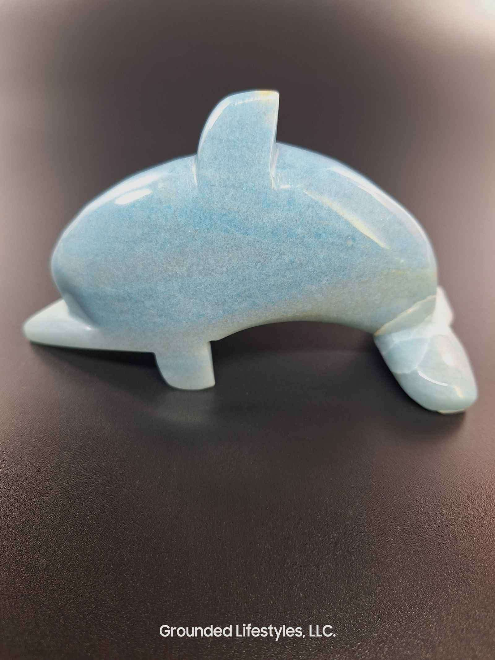 This dolphin sculpture measures approximately 5 inches in length, 1.5 inches in width, and 3 inches in height. Its polished finish emphasizes the natural blue hues of the mineral, making it a visually striking piece. Ideal for shelves, desks, or crystal collections, it adds elegance and symbolic meaning to any space.