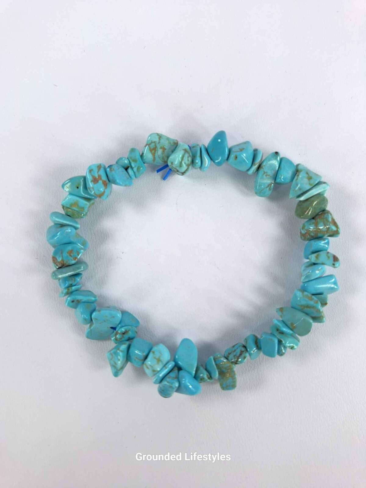 This Turkenite chip bracelet offers the striking turquoise-blue tones so many love, while being crafted from natural howlite that’s been dyed to enhance its color. Each irregular chip bead adds texture and organic appeal, making it a versatile accessory for casual or boho-inspired looks.
