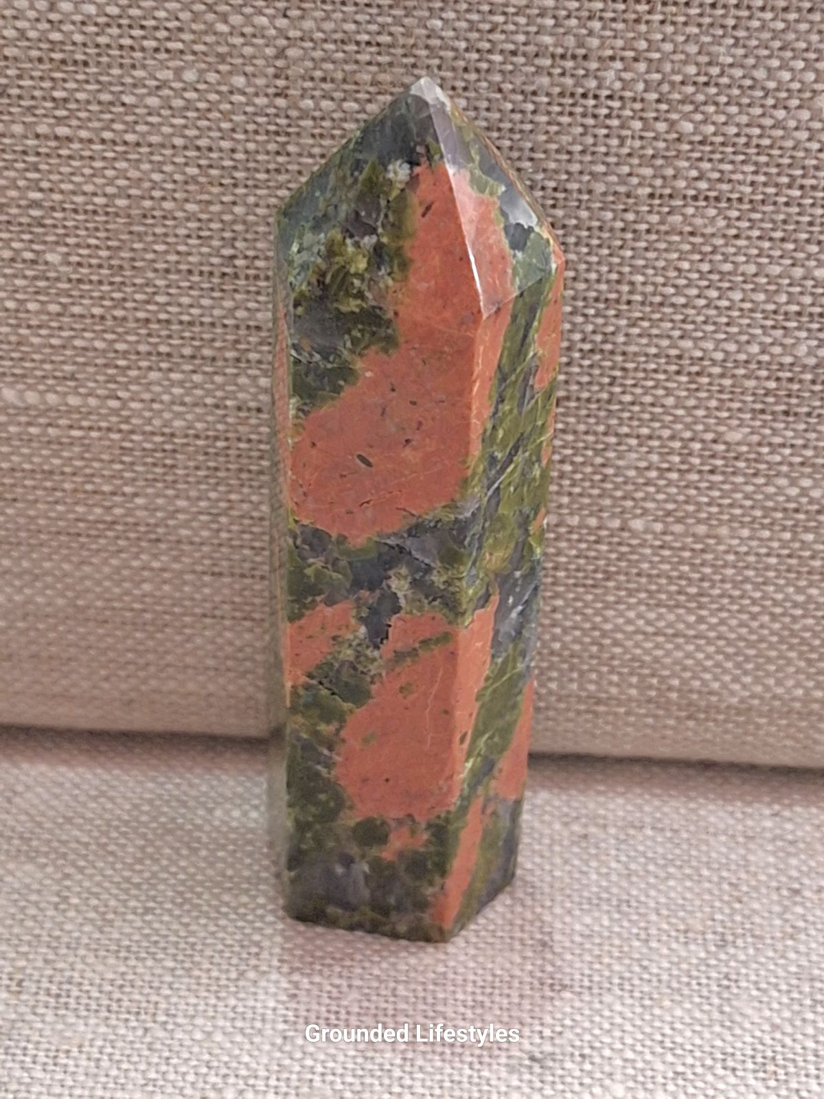 This 3.25-inch unakite point is carved from a naturally mottled mixture of green epidote, salmon-pink feldspar, and colorless to milky quartz. Artisans shape the stone into a tapered point with polished facets that reveal the intricate interplay of its mineral components.